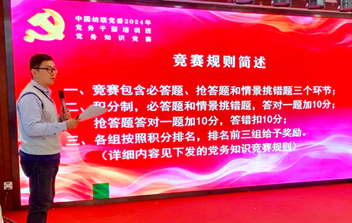 培訓班的黨務知識競賽階段由黨委辦公室副主任吳末寒主持。在專題輔導的基礎上,培訓班組織了知識競賽和情景模擬的教育方式,為學員送上一堂知識性和趣味性并存的黨務大餐,讓大家在熱烈的、沉浸式的學習中增強學習興趣,提升學習效果。競賽將人員分成8個小組,設置“初露鋒芒”“搶占先機”“火眼金睛”三個環節,在各組組長的率領下,學員們同場競答,氣氛熱烈,最終決出一、二、三等獎,并進行了現場頒獎。通過比賽,加深了黨務干部對黨務知識的理解和掌握,達到了以賽帶學,以學促用的目的。