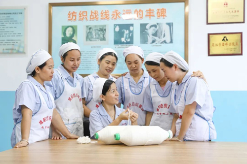 2017年5月她帶領小組率先實行寶塔式分段換粗紗法,改善了落紗工整段換紗不及時造成的空粗紗、小紗巴、絡筒打紗難的現狀;2018年帶領小組積極創造細紗長車值車落紗工作法,實現一崗多能,使每名組員都把自己鍛造成既能值車、又會落紗、還會搖車的多面手。經過三個多月的實戰與磨合,小組在全行業率先實現了值車落紗換紗一體化。“我們在一個崗上先試驗,用了不到4個月的時間,率先在全行業實現了值車、落紗、換紗一體化,使每名組員都鍛煉成了多面手。”何菲介紹。