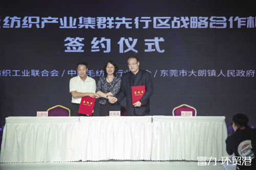 中國紡織工業聯合會副會長、中國針織工業協會會長楊紀朝,中國紡織工業聯合會副秘書長、科技發展部主任、中國毛紡織行業協會會長彭燕麗,中國紡織工業聯合會產業集群工作委員會秘書長邢冠蕾,中國紡織機械協會會長顧平,中國流行色協會會長朱莎,大朗鎮黨委副書記、鎮長方德佳,東莞市毛織服裝設計師協會會長陳敬東,富力集團副總經理兼富力環貿港副董事長程怡等領導嘉賓,以及相關國家行業協會領導、大朗鎮部分黨政人大班子成員、協辦單位代表、采購商代表、大朗毛織企業代表、媒體記者等共500余人參加了本次活動。 當前,中國紡織工業聯合會在全國范圍內推動“世界級產業集群先行區”的建設,大朗作為全國首批“中國羊毛衫名鎮”,依托雄厚的產業基礎和完善的產業配套,積極與中國紡織工業聯合會、中國毛紡織行業協會三方共建“世界級毛織產業集群先行區”。