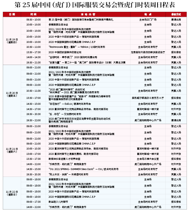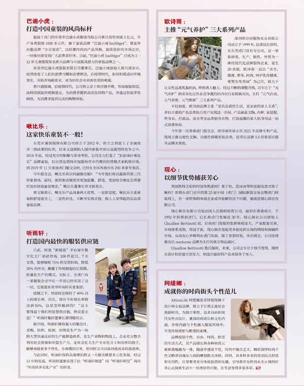 突出“五新”,增強產(chǎn)業(yè)內(nèi)生動力 據(jù)展會主辦方負(fù)責(zé)人介紹,本屆服交會突出五新,即:展會的新模式、虎門的新活力、產(chǎn)業(yè)的新風(fēng)貌、行業(yè)的新趨勢、經(jīng)濟的新動力。 展會的新模式。后疫情時代和數(shù)字經(jīng)濟時代,新渠道和新營銷模式成為企業(yè)高質(zhì)量發(fā)展的迫切需求。為此,本屆服交會將實現(xiàn)線上線下聯(lián)動辦展,首次開啟線上云展會,以直播、VR、5G等技術(shù),以圖文、視頻多維度展示展商和展品信息,讓無法到場的采購商與展商無縫對接,實現(xiàn)展商云展示、采購商云逛展。 同時,服交會期間豐富多彩的時尚發(fā)布、設(shè)計賽事、專業(yè)論壇、對接會、交易會等線下活動,也將通過直播手段實現(xiàn)線上線下同步。組委會邀請的專業(yè)直播團隊還將以走展的形式,縱覽各展位的各種細(xì)節(jié),將時尚趨勢與流行元素零距離呈現(xiàn)于觀眾眼前。 虎門的新活力。當(dāng)前,虎門正牢牢把握粵港澳大灣區(qū)建設(shè)、深圳建設(shè)中國特色社會主義先行示范區(qū)、東莞建設(shè)廣東省制造業(yè)供給側(cè)結(jié)構(gòu)性改革創(chuàng)新實驗區(qū)“三區(qū)”疊加的重大戰(zhàn)略機遇,堅持以東莞濱海灣新區(qū)的發(fā)展為牽引和推動,積極拓展產(chǎn)業(yè)發(fā)展空間,大力提升城市品質(zhì),加快新舊動能轉(zhuǎn)換,致力推動更高水平的開放、更高質(zhì)量的發(fā)展。 同時,虎門服裝產(chǎn)業(yè)集群龐大、產(chǎn)業(yè)鏈條完善、市場體系成熟,吸引了越來越多的知名企業(yè)落戶虎門或參展服交會,例如法國人Claudine Bertinotti創(chuàng)立的現(xiàn)心制衣公司、歐詩雨服飾、浙江菲茉茜品牌管理公司、深圳詩曼芬公司、廣州潮流薈供應(yīng)鏈管理公司……他們十分期待在本屆服交會期間尋得合作機遇。 產(chǎn)業(yè)的新風(fēng)貌。經(jīng)歷疫情的洗禮,虎門服裝產(chǎn)業(yè)仍然保持良好勢頭,一方面是因為產(chǎn)業(yè)實力雄厚、根基穩(wěn)固,另一方面則是由于企業(yè)自身實力強勁,適時調(diào)整經(jīng)營策略,抗風(fēng)險能力強。作為產(chǎn)業(yè)發(fā)展的縮影,本屆服交會期間,虎門服裝產(chǎn)業(yè)的風(fēng)貌也將得到良好展現(xiàn)。 行業(yè)的新趨勢。本屆服交會仍然是潮流趨勢的大看臺,虎門實力品牌以純、富民、歐點、意澳、木棉道、艾加茜等9場時裝表演,將傾力展示虎門服裝的原創(chuàng)設(shè)計實力。此外,“全球時尚·牽手虎門”2020國際時尚擂臺秀將引爆本屆服交會,來自法國巴黎的NeithNyer、美國紐約的Angelann、英國倫敦的JEFF BANKS、意大利米蘭的 Alberto Zambelli和中國的Alicia Lee 五大全球著名設(shè)計師品牌將進行時尚巔峰對決。此外,時尚賽事、趨勢發(fā)布等異彩紛呈的各類活動,將共同剖析當(dāng)今行業(yè)趨勢,破解時尚密碼。 經(jīng)濟的新動力。后疫情時代,對于國內(nèi)市場拓展,國家已經(jīng)提出了構(gòu)建“以國內(nèi)大循環(huán)為主體、國內(nèi)國際雙循環(huán)相互促進的新發(fā)展格局”。虎門將積極融入“國內(nèi)國際雙循環(huán)”,以第25屆服交會為構(gòu)建“雙循環(huán)”格局的重要窗口,為虎門經(jīng)濟社會的發(fā)展注入新的動力。