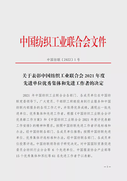 附:《關于表彰中國紡織工業聯合會2021年度先進單位、優秀集體和先進工作者的決定》