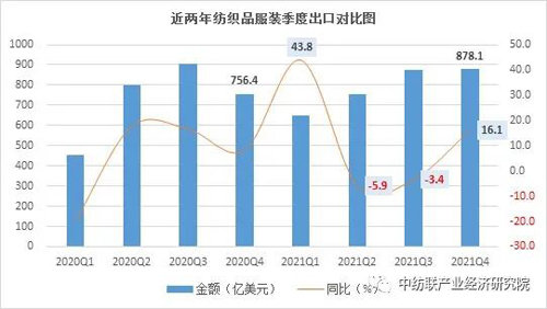 ![]() 從季度數(shù)據(jù)看,一季度在上年低基數(shù)效應(yīng)下,出口呈迅猛增長態(tài)勢,增速達到43.8%;二、三季度由于基數(shù)上升以及防疫產(chǎn)品口罩、防護服出口回落,同比分別下降5.9%和3.4%;到四季度,在國際市場需求增加、節(jié)日促銷的拉動下,紡織品服裝出口快速增長,增速達到16.1%,帶動全年出口超過預(yù)期。
