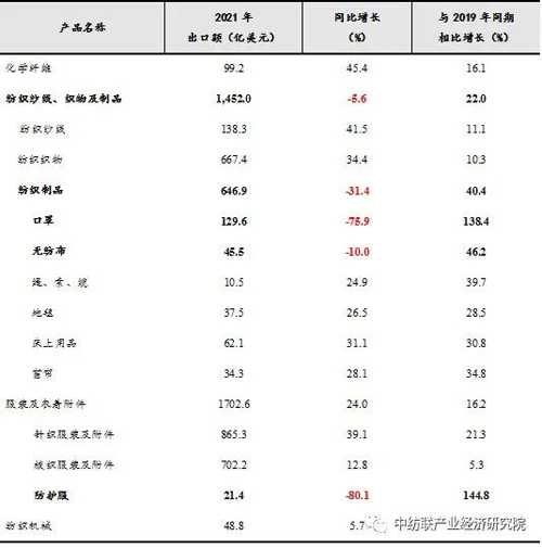 2021年我國紡織產(chǎn)業(yè)鏈上主要商品出口表