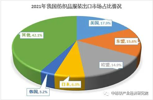 經(jīng)過2020年疫情的沖擊,各國紛紛出臺應(yīng)對疫情的政策,2021年各國進入疫情常態(tài)化運行。美國、歐盟等發(fā)達國家采購模式再度向“中國+越南+其他亞洲低成本國家”回歸,2021年我國紡織品服裝出口東盟占比回升。歐盟、日本市場在對防疫產(chǎn)品需求下降的情況下,拉動我國紡織品服裝對其出口下滑。雖然美國市場對防疫產(chǎn)品需求也有下降,但對家紡、服裝產(chǎn)品需求增長迅猛,穩(wěn)占我國紡織品服裝出口第一大市場地位。