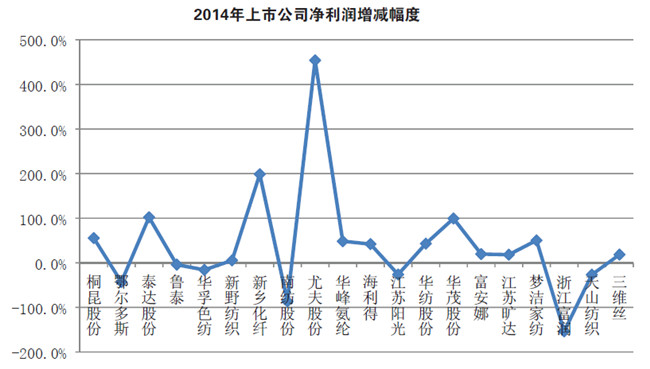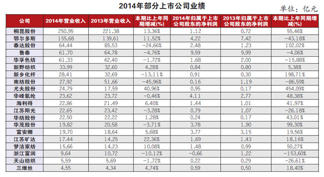 本刊記者-陸健 近期,紡織服裝行業部分上市公司披露了2014 年度年報。我們選取了行業內具有代表性的20 家紡織上市公司,包括:華峰氨綸、新鄉化纖、桐昆股份、浙江富潤、華紡股份、華孚色紡、華茂股份、魯泰、南紡股份、天山紡織、新野紡織、鄂爾多斯、江蘇陽光、尤夫股份、海利得、三維絲、江蘇曠達、泰達股份、富安娜、夢潔家紡等,對這些企業從營業收入、凈利潤等財務角度進行分析,并對年報披露的內容進行歸納總結,希望借此能夠把脈紡織行業骨干企業的變化趨勢。
