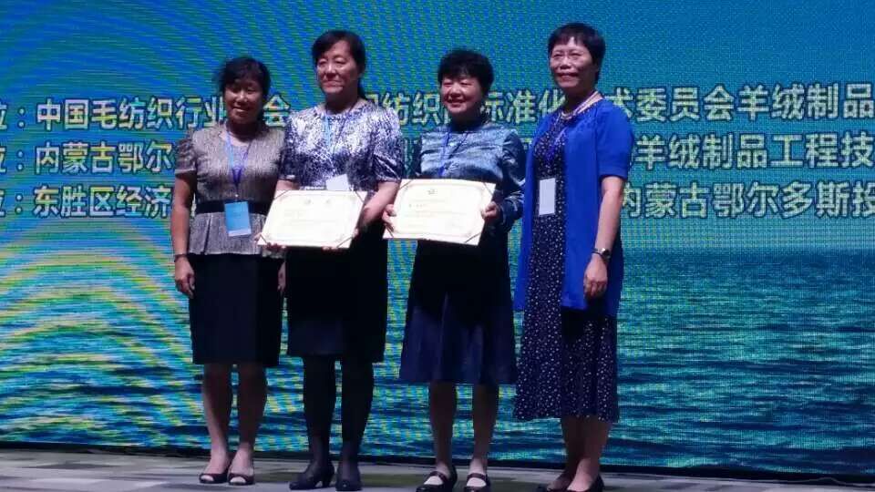 中國紡織工業(yè)聯(lián)合會副秘書長、科技部主任彭燕麗,中國毛紡織行業(yè)協(xié)會會長黃淑媛頒發(fā)山羊絨專業(yè)委員會主任及常務(wù)副主任聘書