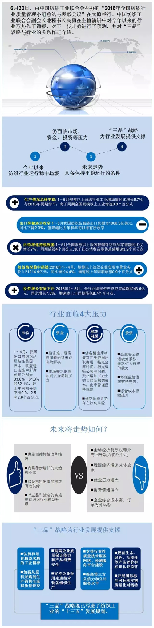 2016年不僅僅是“十三五”開局之年,也是我們行業按照國家的部署,進一步提升質量、增加品種和塑造品牌的重要一年。全行業要進一步夯實質量基礎,提升行業整體質量,推動行業結構性調整,促進行業轉型升級,塑造行業的品牌形象。我們要深刻領會黨的十八大以及十八屆五中全會的精神,在國家經濟和行業發展“新常態”的大背景下,以“三品”戰略為綱領,以“萬眾創新”為途徑,讓創新驅動模式、質量效益模式、品牌效益模式來推動紡織行業穩定、健康、高效、可持續發展,為實現紡織行業建設強國目標做出不懈努力。