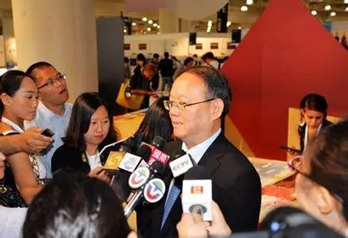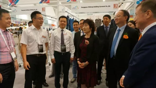 △市毛協黨支部書記、副會長周淦華代表大朗展團向與會領導介紹大朗毛織有關情況 中國紡織工業聯合會會長副會長兼秘書長高勇、中國紡織工業聯合會顧問張延愷、中國貿促會紡織行業分會常務副會長徐迎新、中國駐紐約總領事章啟月等出席展覽會開幕式,并參觀了大朗毛織特色展區,對近年來大朗的的發展以及堅持抱團參展的的做法給予了高度評價。