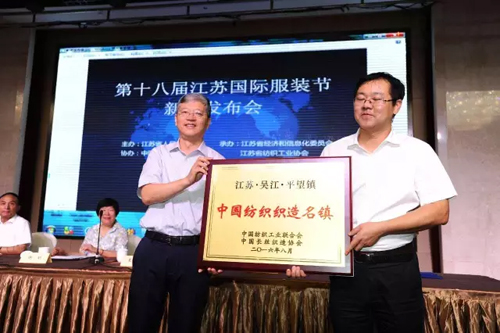 王志忠在新聞發布會上指出:紡織服裝行業是江蘇國民經濟傳統支柱產業和重要民生產業,也是國際競爭優勢明顯的產業。江蘇省紡織服裝產業無論是數量還是層次上均居全國前列。規模總量全國領先,利潤總額全國最高,外貿出口總體平穩,產業集群實力雄厚。今年上半年,江蘇紡織服裝行業實現主營業務收入7148.84億元,同比增長5.16%;全行業實現利潤總額370.7億元,同比增長8.38%,繼續保持了健康穩定的態勢。 他表示,江蘇國際服裝節是江蘇省政府重點打造的會展品牌之一,是專門為江蘇省內外紡織服裝行業打造的交流、展示和服務的平臺。今年,服裝節已經走進第十八個年頭了。十八年來,江蘇國際服裝節緊扣當前行業發展形勢,年年有亮點、屆屆有創新,在推動行業發展、加快自主品牌和集群品牌建設、提升江蘇時尚地位、擴大區域影響力等方面作出了突出貢獻。 產業集群再添喜 平望鎮、鹽城市等獲授牌表彰 在行業盛事江蘇國際服裝節即將舉辦之際,江蘇紡織服裝產業集群再添喜。在此次新聞發布會期間,舉行了產業集群試點單位的授牌儀式。