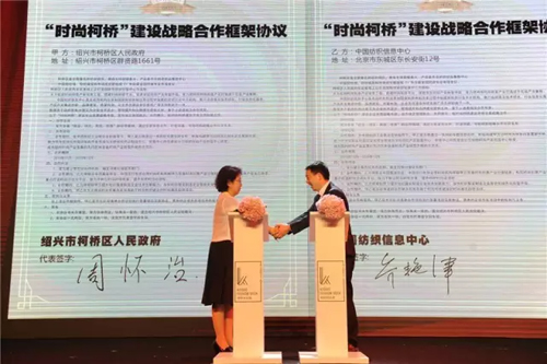 值得一提的是,在發布會現場,中國紡織信息中心、國家紡織產品開發中心與紹興市柯橋區人民政府共同簽署了“時尚柯橋建設戰略合作框架協議”。中國紡織信息中心主任喬艷津、紹興市柯橋區人民政府副區長周懷治作為雙方代表在會上簽署協議。 在“柯橋時尚匯”環節,喬艷津、李斌紅、周懷治,以及作為柯橋企業代表的上海瑩寇服飾有限公司、浙江彩虹莊有限公司董事長周靜,紹興皕帛仁紡織品有限公司總經理潘敏從不同層面和角度對此次雙方的戰略合作、時尚周的定位以及柯橋時尚產業的創新實踐展開了深入的探討。