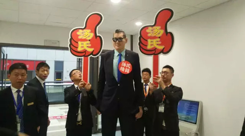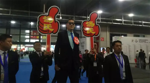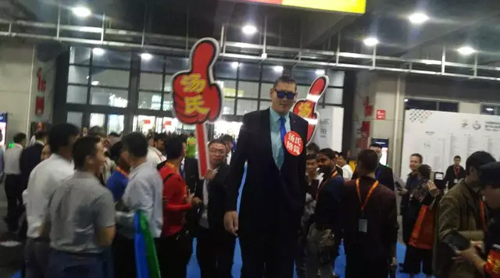 對,這就是H2湯氏紡機展臺:湯公子給整個展會準備的第一個節目——22日上午,國際巨星姚明戰友、亞洲第一巨人張歡將助陣湯氏展臺,2米38的身高告訴你什么叫什么叫真正的仰慕。一亮相便引爆全場!