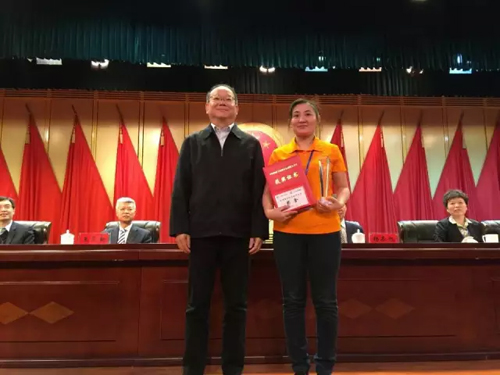 高勇為大賽第一名菅敏頒獎,他希望紡織職工要形成刻苦學習,崇尚技能,立志成才的好風氣, 通過學習、練兵、競賽培養出更多更好的高技能人才。 獲得前六名的選手還獲得了“全國紡織行業技術能手”稱號,獎金由紡織之光科技教育基金會給予支持。