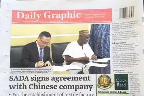 在4日上午的工作會(huì)談中,SADA介紹了其主要職能,即促進(jìn)占加納領(lǐng)土面積54.4%的北部地區(qū)的快速、綜合發(fā)展,包含社會(huì)、基礎(chǔ)設(shè)施、農(nóng)業(yè)和工業(yè)等諸多領(lǐng)域,實(shí)現(xiàn)發(fā)展經(jīng)濟(jì)和消除貧困的目的。 據(jù)SADA介紹,加納北部毗鄰非洲的傳統(tǒng)棉花生產(chǎn)大國(guó)布基納法索,氣候條件、土壤和灌溉條件、種植歷史等適合恢復(fù)和擴(kuò)大發(fā)展棉花種植。根據(jù)SADA的前期研究,有 50萬公頃的土地都是棉花種植的合適區(qū)域,但由于棉花公司倒閉、金融支持匱乏等原因,目前的棉花種植面積只有不到一萬公頃,處于歷史低位。SADA希望中國(guó)紡織業(yè)和農(nóng)業(yè)方面的投資者能夠幫助加納循序漸進(jìn),逐步實(shí)現(xiàn)發(fā)展從棉花種植到棉紡的垂直產(chǎn)業(yè)鏈的戰(zhàn)略目標(biāo)。 工作會(huì)談后,在總統(tǒng)秘書Kwesi Quartey見證下,中國(guó)紡織工業(yè)聯(lián)合會(huì)徐迎新副會(huì)長(zhǎng)與SADA的CEO Charles A. ABUGRE先生簽署了關(guān)于棉花和紡織生產(chǎn)、貿(mào)易方面的合作諒解備忘錄。