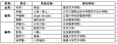 銅獎獲獎者及指導老師。 本屆大賽由中國家用紡織品行業協會與江蘇省蘇州市吳江區人民政府主辦,中國家用紡織品行業協會設計師分會、震澤鎮人民政府和吳江絲綢文化創意產業園聯合承辦。 大賽共收到參賽作品1575幅,經過專家評審委員會的層層遴選,最終評選出金獎1名、銀獎3名、銅獎5名、優秀獎30名、最佳創意設計應用獎5名、最佳設計題材獎5名、最佳傳統紋樣表現獎5名,入圍獎若干。