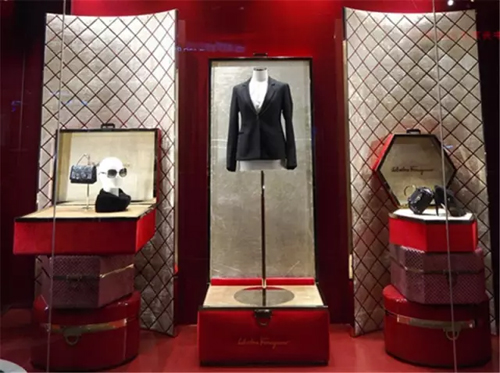 Salvatore Ferragamo圣誕櫥窗給出兩種風格,一種是利用天然木材、貓頭鷹標本營造自然環境凸顯配上皮具特質。另一類的主題是“禮物”,將服飾及配飾放入各類形態的禮物盒子內,兩套方案一套藝術創新,一套溫馨傳統。 PRADA