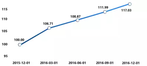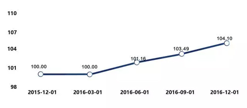 1、時尚設計人才指數 近年來,柯橋一邊大力引進外地設計師,一邊不斷培養、推廣本土設計師,越來越多設計師的加入和孵化,使得柯橋的時尚氛圍越來越濃厚。2016年第四季度時尚設計人才指數為104.10點,環比增加0.61點,漲幅為0.58%。 圖1-2 時尚設計人才指數
