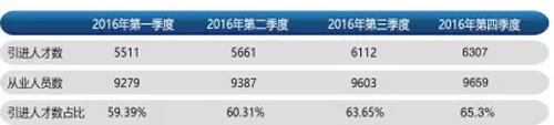 從業人員數穩步提升,引進人才愈發重要。2016年第四季度柯橋區時尚設計從業人員數為9659人,指數值達104.10點,較于第一季度增長380人,增幅為4.10%。如下表1-1所示,引進人才數和從業人員數均獲得增長,但引進人才數在從業人才數中的占比從59.39%增加到65.3%。在柯橋推進時尚產業的今天,引進人才在柯橋區從業人員數中具有不可忽視的重要性,并且隨著柯橋政府關于時尚創意產業政策的實施,引進人才獎占據更加重要的位置。 表1-1 引進人才數&從業人員數