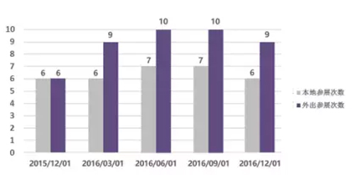 2、企業參展指數 企業參展指數第四季度達125.00點,與第一季度相比保持不變,較于第三季度環比跌幅為-11.76%,說明相對于第四季度,第三季度時企業參展更加頻繁。 (1)第三季度各大展會集中于柯橋召開。9月12日紹興第十五屆(秋季)家居博覽會,9月4日2016紹興第二十五屆中國輕紡城(秋季)汽車博覽會,9月23日2016浙江(柯橋)運動休閑旅游博覽會,10月14日2016中國柯橋國際紡織品博覽會等各大博覽會在中國輕紡城會展中心舉辦,為柯橋本地的企業構建交流平臺,吸引柯橋各類企業參會。這是本地參展次數上升的主要原因。 (2)各地爭相舉辦服裝紡織類展會,柯橋企業給予重視。柯橋作為中國輕紡城,目前全國規模最大、設施齊備、經營品種最多的紡織品集散中心,也是亞洲最大的輕紡專業市場。而隨著國內各地紡織業的發展,各類紡織展會也在不同區域召開。如8月7-9日,2016(秋)深圳國際家居軟裝博覽會暨廣東家紡協會“雙二十周年”慶在深圳舉辦,2016年10月11日到13日,中國國際紡織紗線(秋冬)展覽會在上海舉辦,10月16日中國國際絲綢博覽會在杭州舉辦。柯橋企業為拓展銷售渠道,增強業界交流,重視各類服裝紡織相關展會,因而外出參展頻繁。 圖1-12 企業本地與外出參展情況對比