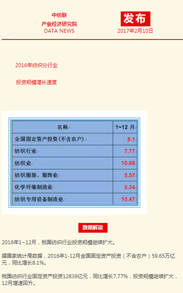 去年全年我國紡織業固定資產投資12839億元,同比增長7.77%