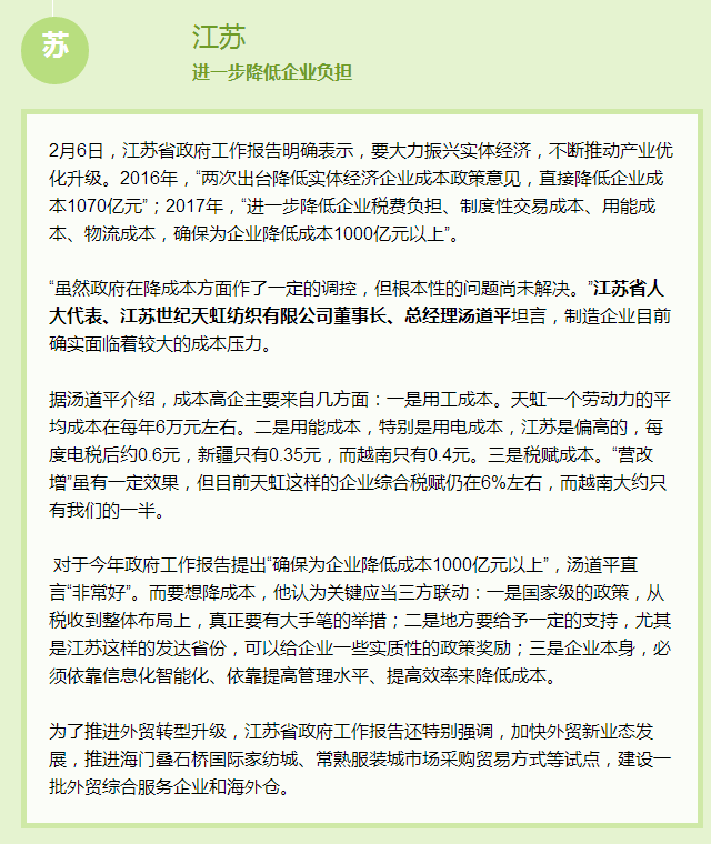 | 盤點各地兩會,江蘇、浙江、廣東等紡織大省都樹立了哪些促進行業業發展小目標? |