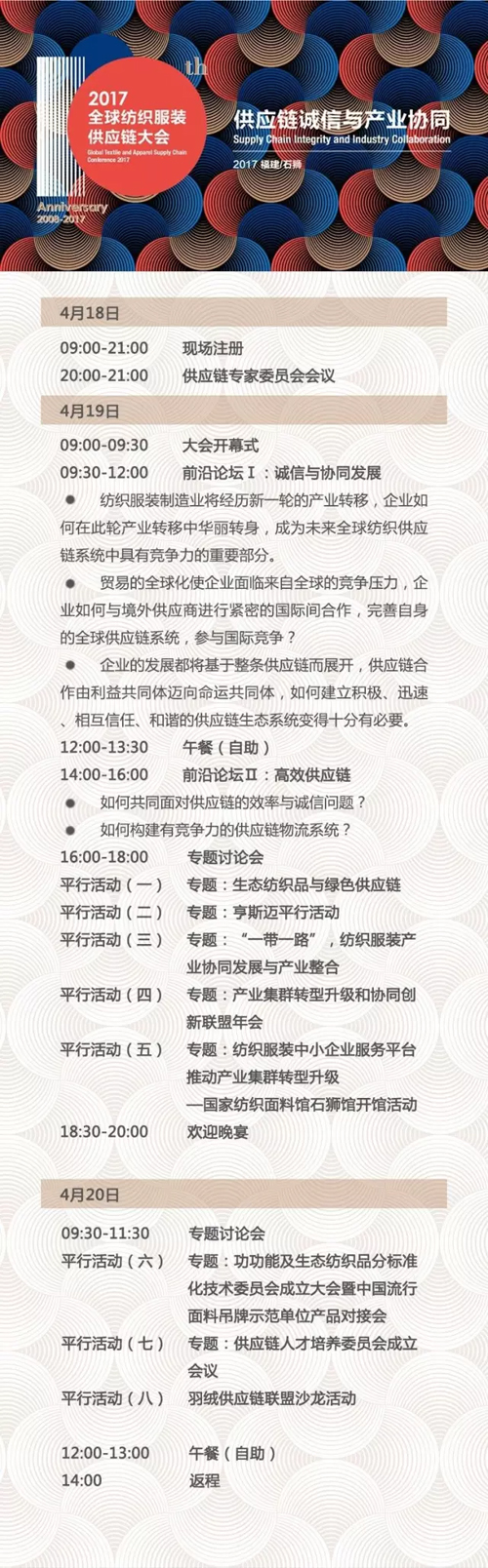 本刊記者-羅欣桐 4月19日, 2017全球紡織服裝供應鏈大會 將在福建石獅舉行。 距離2008年全球紡織服裝供應鏈大會的 首次舉辦, 已然光陰十載…… 作為中紡聯每年舉行的關注紡織服裝供應鏈管理和品牌發展的國際交流盛事,全球紡織服裝供應鏈大會立足于中國紡織服裝最發達的產業集群,致力于提高中國紡織服裝企業供應鏈管理水平和競爭力,促進中國紡織服裝企業在國際供應鏈中合作與協同創新。 對此,《紡織服裝周刊》聯合全球紡織服裝供應鏈大會,推出“供應鏈?十年之變”系列報道,邀請行業領導、企業家代表,以及國內外專家,寄語全球紡織服裝供應鏈大會,共探產業未來。