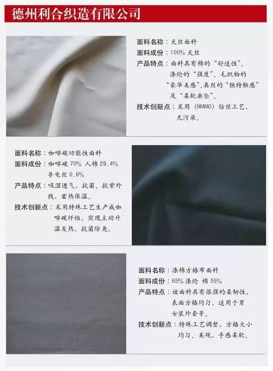 你就是那顆最閃亮的星 2017“中國(guó)面料之星”用戶最滿意面料產(chǎn)品調(diào)查活動(dòng)由中國(guó)紡織工業(yè)聯(lián)合會(huì)指導(dǎo),《紡織服裝周刊》雜志社主辦,德州恒豐集團(tuán)協(xié)辦,以引導(dǎo)產(chǎn)品開(kāi)發(fā)與終端市場(chǎng)應(yīng)用領(lǐng)域?qū)訛槟繕?biāo),旨在通過(guò)對(duì)國(guó)產(chǎn)面料的全面檢視,調(diào)查并反饋用戶企業(yè)的真實(shí)評(píng)價(jià),推動(dòng)面料開(kāi)發(fā)與服裝品牌設(shè)計(jì)的深度聯(lián)動(dòng),搭建起紡織服裝行業(yè)上下游互動(dòng)交流的有效平臺(tái)。 這一期,我們給大家介紹的是來(lái)自德州利合織造有限公司、長(zhǎng)勝紡織科技發(fā)展(上海)有限公司、無(wú)錫恒諾紡織科技有限公司等5家企業(yè)的參賽面料,這些面料涵蓋了男裝、女裝、休閑裝等領(lǐng)域,在傳統(tǒng)織染工藝的基礎(chǔ)上進(jìn)行了多種創(chuàng)新,尤其是一些新材料的應(yīng)用,使得產(chǎn)品形成了鮮明的風(fēng)格特點(diǎn),在舒適性、功能性及時(shí)尚環(huán)保等方面得到了進(jìn)一步的完善。