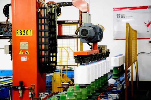 全球首條萬噸級熔體直紡中試基地 當時,國內同行生產的超細纖維規格以0.5dpf(1萬米重量0.5克)為主,而一家日本企業率先將超細纖維單絲細度做到了0.3dpf,并自信地宣稱:這是世界上工業化紡絲的極限。“要做就要比別人做得更好,走差異化發展之路。”涉足化纖行業不久的盛虹集團毅然出資7億元,在歐洲成立研發中心,并聯合清華大學、東華大學專家攻關。 化纖廠區自動化生產車間,機械臂在搬運絲餅 “當時我們把印染業務賺的錢預研化纖新產品,很多人不理解。”繆漢根笑著說。在他的激勵下,企業研發人員頂住壓力潛心攻關。歷時兩年多、經過無數次失敗后,盛虹集團終于成功攻克0.15dpf的“世界極限”,用這種超細絲繞地球一圈共4萬公里只要一斤二兩。與此同時,研發人員在設備、工藝上同步研發,0.15dpf超細纖維單絲很快實現量產,并迅速進入了國內外市場。如今,盛虹的超細纖維年產量,已超過歐美日韓等國家和地區的總和,位居全球第一。