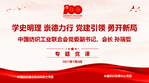 在慶祝中國共產黨成立一百周年大會上,習近平總書記發表了重要講話,全面回顧一百年來我們黨圍繞實現中華民族偉大復興,團結帶領中國人民開辟的偉大道路、創造的偉大事業、取得的偉大成就;莊嚴宣告我們實現了第一個百年奮斗目標,在中華大地上全面建成了小康社會;深刻總結了偉大建黨精神,系統闡述了以史為鑒、開創未來的“九個必須”。這一篇馬克思主義的綱領性文獻,為全黨全國各族人民向第二個百年奮斗目標邁進指明了前進方向、提供了根本遵循。 在新的歷史起點,為深入學習貫徹習近平總書記“七一”重要講話精神,以黨建引領紡織行業各項服務工作,從黨史學習教育中汲取奮進力量,2021年7月6日,中國紡織工業聯合會黨委副書記、會長孫瑞哲為中國紡織建設規劃院聯合黨委、中國紡織信息中心黨委作了題為“學史明理 崇德力行 黨建引領 勇開新局”的專題黨課。