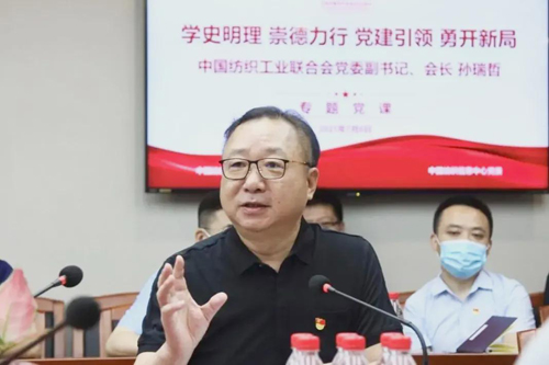 孫瑞哲從中國共產黨的百年發展史、中國紡織工業強國發展史、中國紡聯發展歷程以及新時期行業協會的新要求四個部分與黨員干部作了深入交流分享。黨課把黨史學習教育同總結經驗、行業現實、當前形勢、未來發展緊密結合起來,具有很強的指導性和前瞻性。