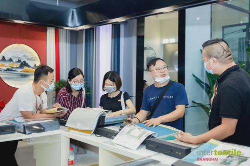 高勇一行走訪中,在華爾泰展位與負責人進行了深入交流。在這里,每塊布料都有專屬二維碼,掃碼即可下單。該展位負責人表示,二維碼會導入微信小程序,華爾泰可以通過監測瀏覽數據,估算備貨范圍以及規模,實現快速反應。高勇一行對企業的創新營銷表示認可,并勉勵企業再接再厲。