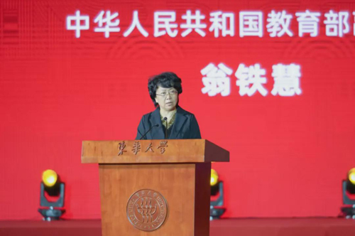 翁鐵慧講話 翁鐵慧在大會上講話。她代表教育部向東華大學全體師生員工和海內外校友致以誠摯的問候。她指出,自建校以來,東華大學在黨的領導下,始終與黨和國家事業發展同心同向同行,為新中國高等教育事業和社會主義現代化建設,為新中國紡織工業的發展壯大和人民生活水平的改善提高作出了歷史性貢獻。作為承擔“雙一流”建設重任的高校,希望東華大學以建校70周年為新起點,擦亮底色,牢牢把握社會主義的辦學方向,進一步弘揚光榮傳統,賡續紅色血脈,牢記為黨育人、為國育才的初心使命;堅守本色,全面落實立德樹人根本任務,把立德樹人內化到學校治理的各領域各方面各環節,堅持用習近平新時代中國特色社會主義思想鑄魂育人、啟智潤心;彰顯特色,積極服務國家重大戰略需求,更加自覺地把學校改革發展放到黨和國家發展大局中去謀劃和推動,不斷增強服務國家戰略和經濟社會發展的特色優勢和戰略定力,在建設教育強國、人才強國、科技強國、制造強國和文化強國的偉大征程上,以富有特色的突出業績和貢獻,織就絢麗多彩的華美畫卷。