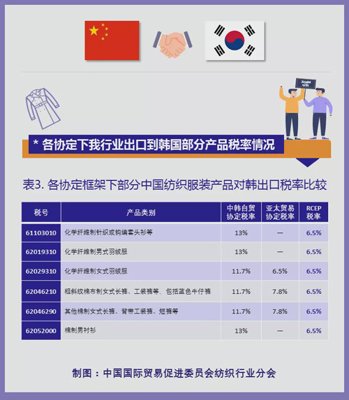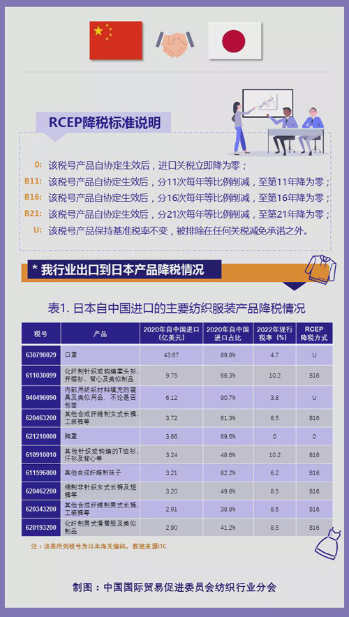 RCEP生效后,日本最終將在15年內對絕大多數中國紡織服裝產品實現零關稅。同時,RCEP與已經實施的中國一東盟、中韓、中澳等自貿協定共同組成了更高水平、更具協同效應的自貿協定網絡,部分產品關稅將更優,有利于區域內多邊貿易的效率提升,擴大我行業整體出口規模。