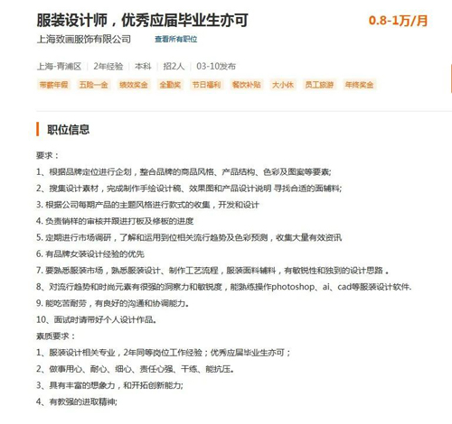 以上海致畫服飾有限公司為例,該公司的招聘崗位超過40個,其中對服裝設計師的崗位職責和任職要求包括,根據(jù)品牌定位進行企劃,整合品牌的商品風格、產(chǎn)品結(jié)構(gòu)、色彩及圖案等要素;搜集設計素材,完成制作手繪設計稿、效果圖和產(chǎn)品設計說明、尋找合適的面輔料;根據(jù)每期產(chǎn)品的主題風格進行款式的收集、開發(fā)和設計;負責銷樣的審核并跟進打版及修版的進度等10余項。