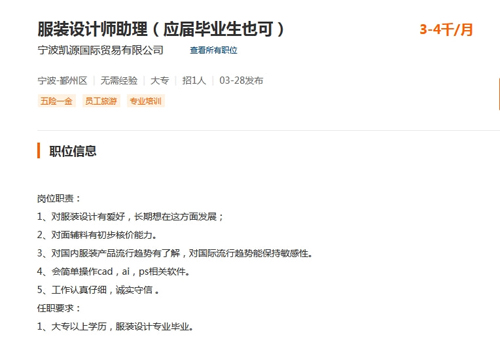 在紡織服裝領域,社會招聘對服裝設計師、面料設計師等的崗位招聘較為常見。在前程無憂網(wǎng)站鍵入應屆生+服裝、應屆生+紡織等關鍵詞,搜索到的崗位以服裝設計師助理、產(chǎn)品研發(fā)師等居多,月薪在4k-8k之間,但凡超過8k的崗位,對崗位職責和從業(yè)經(jīng)驗的要求都相應提升很多。