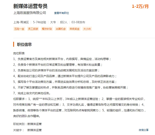 同樣以上海致畫為例,在該公司的招聘信息中,對服裝電商運營專員、新媒體運營專員等崗位的要求雖然同樣嚴苛,但薪資和崗位職能的彈性較大,對于善用新媒體、思維靈活的年輕人來說,具有很大的發(fā)展空間。