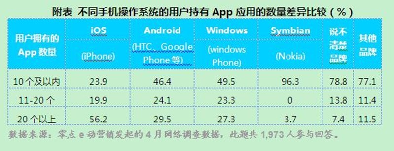 在接受調查的青年網民中,46.2%的人表示手機中擁有的App應用在10個以內,擁有11-20個App的有兩成(21.8%),手機APP數量在20個以上有三成(32%)。 用戶手機里的App數量 ,明顯跟他們所屬的手機陣營直接相關: iOS用戶在終端安裝應用超過20個的超過一半(56.2%),明顯高于Android家族(29.5%)和Windows家族(27.3%)。看來倚靠成熟而領先的市場培育、龐大且不斷創新的應用資源供應,蘋果公司超過500億次下載量可不是隨便吹的。 Android家族和windows家族比較,windows Phone用戶對手機App的熱情還有待提高:表示自己只有1-5個App應用的占到四成(40.4%),比安卓機用戶群多出一成(27.5%)。 相比應用商店里幾何級增長的App數量,用戶下載并持續持有量顯然沒有我們期望的多。蘋果應用商店2012年新增App數量33萬個,同時下架近28萬個,也就是說,每天有700多個App從應用世界里消失 。 作為營銷人和企業的你,會不會有點冷了?
