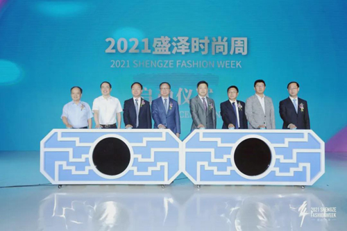 開幕式上,孫瑞哲、陳南梁、邵峰、韓平、吳琦、李銘、王國榮、沈春榮共同為2021盛澤時尚周啟幕。