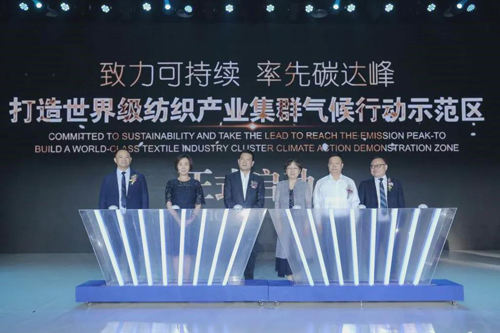 吳江區政協主席李斌,中國紡織信息中心主任喬艷津,中國紡聯社會責任辦公室主任閻巖,吳江區委常委、人武部部長鄭立軍,吳江區副區長季恒義,吳江高新區管委會副主任、盛澤鎮人大主席徐國華共同啟動世界級紡織產業集群氣候行動示范區建設。