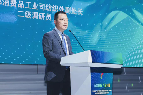 縱瑞龍在會上致辭。他指出,“培育和推廣十大類紡織創新產品專項工作”為助力紡織工業高質量發展貢獻了力量。同時他提出了三點建議:一是引導企業更多運用新型紡織材料,提升紡織產業鏈創新的效率和效果。二是加強傳統文化與現代時尚相結合,推動傳統服飾文化服務現代生活,為中國時尚賦能。三是注重培育綠色低碳循環紡織產品,鼓勵企業生產排放少、能耗水耗低的產品,引導企業多用再生纖維,生產更加便于回收利用的產品。