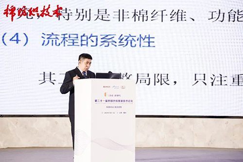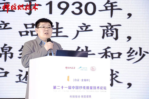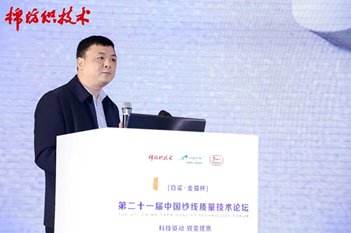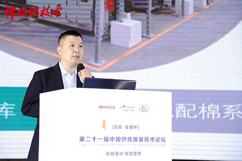 光山白鯊針布有限公司棉紡總工程師陳玉峰作了題為《高效梳理工藝技術現狀及突破》的報告,通過分析傳統提高梳理質量存在設備滯后、工藝局限、器材的針對性、流程的系統性等問題,介紹了近年來梳理新技術發展現狀,總結了白鯊針布在高速度、高質量、高產量、智能化、重定量的條件下系統梳理解決方案所取得的進展和研究成果,為參會代表提供高效梳理方案的借鑒。
