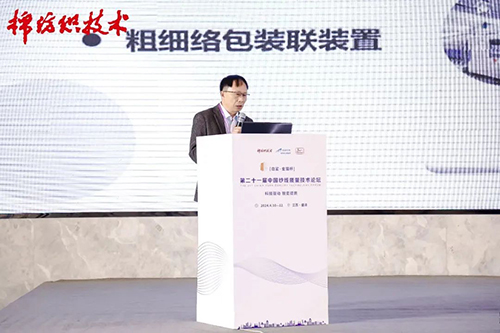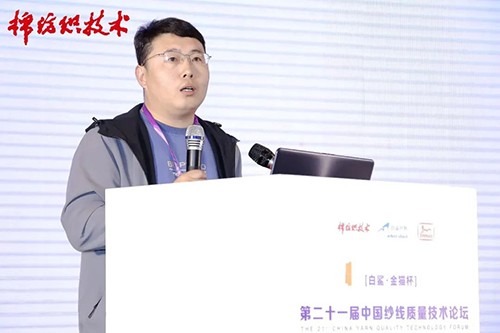 賽特環球機械(青島)有限公司銷售總監陳濤的報告題目是《紡紗智慧工廠裝備創新應用》,他介紹了新一代智能粗紗機、第四代筒紗智能柔性包裝線的優勢與特點。新一代智能粗紗機采用“機電軟管一體化”和“模塊化”設計理念,實現了紡紗速度、紡紗效率、紡紗錠數的新突破;第四代筒紗智能柔性包裝線安全、穩定、高效,2023年12月全球首條在線回潮智能筒紗包裝線成功應用,實現了筒紗在線空中預配重,加濕庫回潮后二次配重,全流程在線回潮筒紗智能包裝。