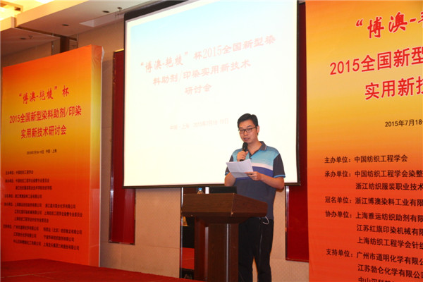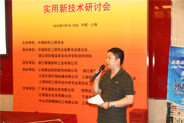本刊記者 趙國玲 文/攝 7月19日,由中國紡織工程學(xué)會主辦,中國紡織工程學(xué)會染整專業(yè)委員會、浙江紡織服裝職業(yè)技術(shù)學(xué)院紡織學(xué)院承辦,浙江博澳染料工業(yè)有限公司冠名,上海雅運紡織助劑有限公司、江蘇紅旗印染機械有限公司等協(xié)辦的“博澳-艷棱”杯2015全國新型染料助劑/印染實用新技術(shù)研討會在上海如期舉行。行業(yè)協(xié)會、產(chǎn)業(yè)集群地、染整企業(yè)、染化料助劑企業(yè)及相關(guān)設(shè)備企業(yè)代表等250余人共聚一堂。