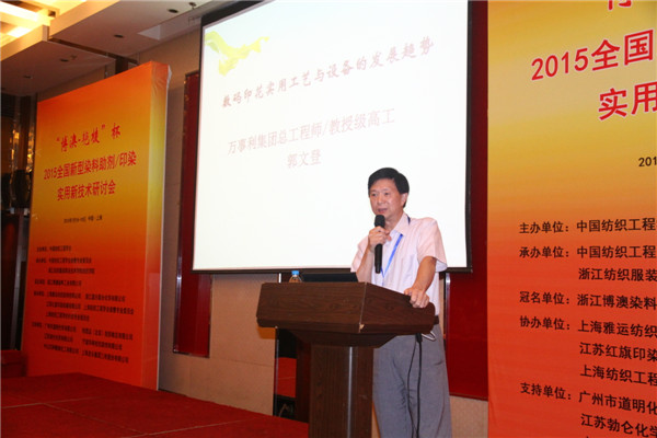 同時為更好地表彰先進,開幕式現(xiàn)場還從征集的59份論文中,評選出10份優(yōu)秀論文進行表彰。 整個研討會歷時一天,共有20余名行業(yè)專家及企業(yè)代表從數(shù)碼印花實用工藝與設(shè)備及發(fā)展趨勢、新型反應(yīng)性染料的性能與實用技術(shù)、當(dāng)前織物的防拔染印花工藝及生產(chǎn)、節(jié)能減排印染實用技術(shù)急需解決的問題及思路等方面做了專題學(xué)術(shù)報告,各與會嘉賓精彩、實用的技術(shù)分享贏得了與會聽眾的陣陣掌聲。晚上舉行的技術(shù)交流及“互聯(lián)網(wǎng)+”專題,從如何利用“互聯(lián)網(wǎng)+”為上下游企業(yè)發(fā)展提供服務(wù)、企業(yè)實用技術(shù)交流案例分析、專家答疑等三個方面展開,各與會嘉賓暢所欲言,整個會議現(xiàn)場甚是熱鬧,各與會代表紛紛表示收獲頗豐。 現(xiàn)場鏈接: 數(shù)碼印花實用工藝與設(shè)備及發(fā)展趨勢 報告嘉賓:萬事利集團有限公司總工 郭文登