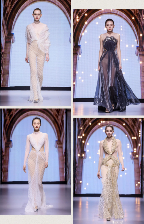 ![]() 在充滿異域風(fēng)情的“巴爾米拉女王”主題發(fā)布中,法國高定女裝設(shè)計師Jad Adam攜手紹興永耀紡織品有限公司、紹興晶遠(yuǎn)創(chuàng)意設(shè)計有限公司展現(xiàn)了尋找內(nèi)心平靜的啟蒙之旅的獨(dú)特過程。設(shè)計師從柯橋優(yōu)秀的面料中獲得啟發(fā),在華麗的禮服裙中采用了大量的刺繡及繡片繡珠工藝。兩家企業(yè)提供的閃光高密度歐根紗、銀色金屬絲、清透網(wǎng)眼等面料,花型立體簡潔、色彩透亮多變,為設(shè)計師帶來了豐富的靈感。從晚禮服、婚紗到高級時裝,Jad Adam通過特有的藝術(shù)表現(xiàn)手法詮釋了本次禮服設(shè)計。