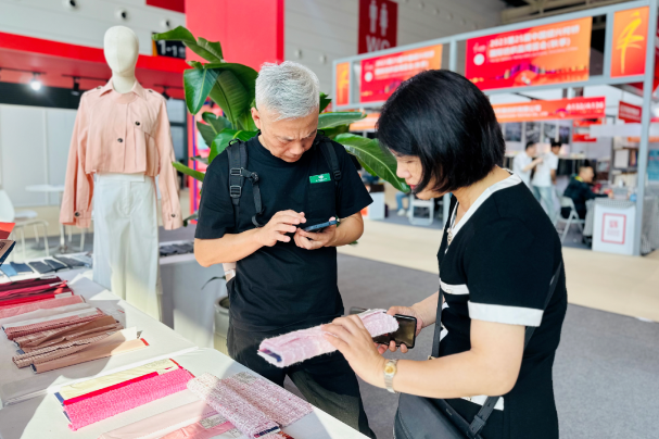 在“中國面料之星·星聚薈”展示區,參觀者絡繹前來并駐足觀賞,他們近距離觀察和感受每款面料的質感、顏色和紋理,從而更準確地了解產品的特點和性能。豐富的面料品種更為尋求好產品的采購商帶來了許多選擇與驚喜。