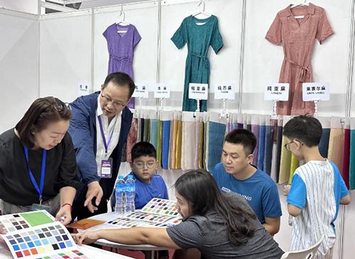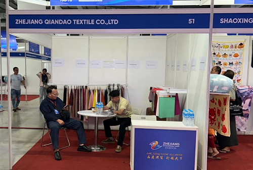 紹興柯橋渡深紡織有限公司已經(jīng)是第二次參加緬甸紡織展,對于緬甸的紡織市場非常熟悉。公司早幾年就在緬甸設(shè)立了辦事處,雇傭了緬甸當?shù)氐膯T工,建立起了貿(mào)易前哨站,所以渡深的攤位上客戶可謂是絡(luò)繹不絕,對當?shù)厥袌龅纳罡K得到回報,參展負責人王總表示,本次參展意向成交額200萬美金。