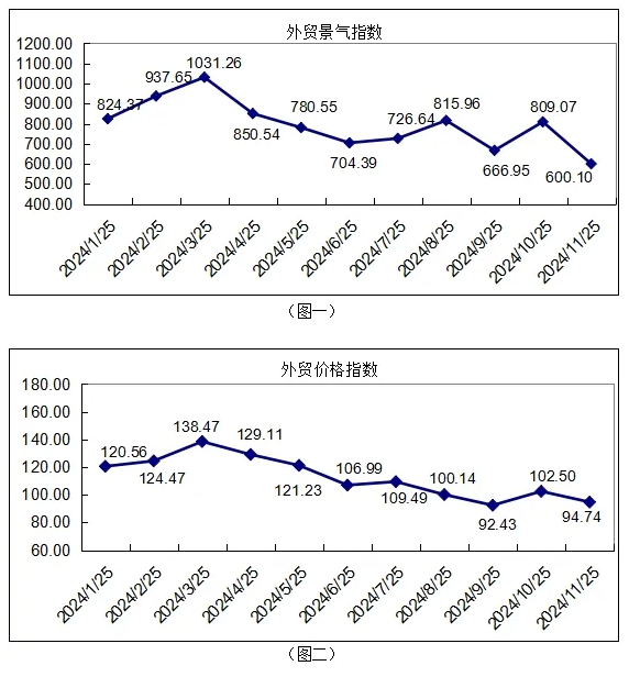 如圖1、圖2所示,2024年11月份外貿景氣指數收600.01點,環比下跌25.83%;外貿價格指數收于94.74點,環比下跌7.57%;外貿信心指數收于997.12點,環比下跌9.89%。