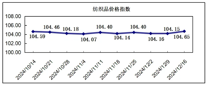 ![]() ![]() “中國(guó)·柯橋紡織指數(shù)” 20241216期紡織品價(jià)格指數(shù)收?qǐng)?bào)于104.65點(diǎn),環(huán)比上漲0.48%,較年初下跌0.47%,同比下跌0.70%。