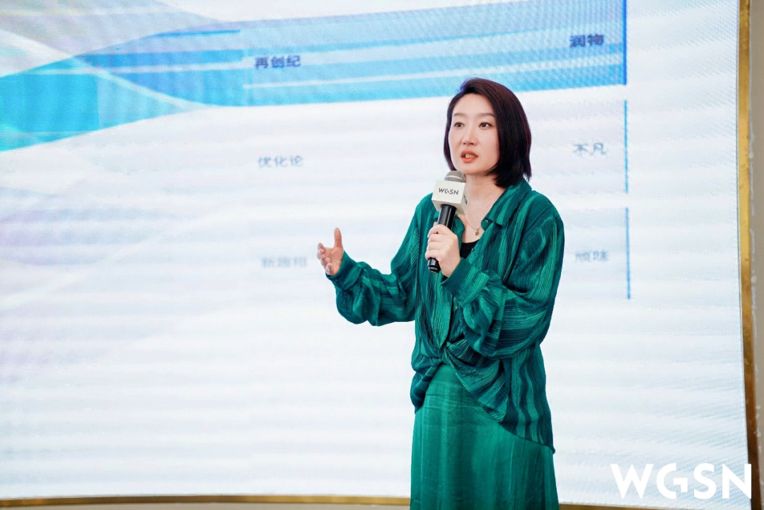 ![]() 緊接著,WGSN中國區趨勢總監門淑萍發布了2026春夏女裝趨勢。她以“趨勢如何而來?”為開篇,系統梳理了趨勢生成的底層邏輯,并講解WGSN2026春夏女裝的三大主題方向——“潤物”、“不凡”、“頑味”,分別聚焦手工細節與自然親近、未來主義與極簡美學,以及情緒微光與觸感設計,展現出未來時尚的多元走向。