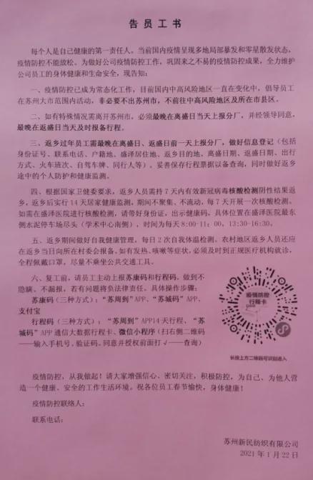蘇州新民紡織有限公司黨委第一時間向員工傳達疫情防控要求,出臺告知書,倡導就地過年,黨員主動協助公司做好需返鄉員工統計,對于經過風險區或者前往風險區的員工逐一勸其留廠過年。